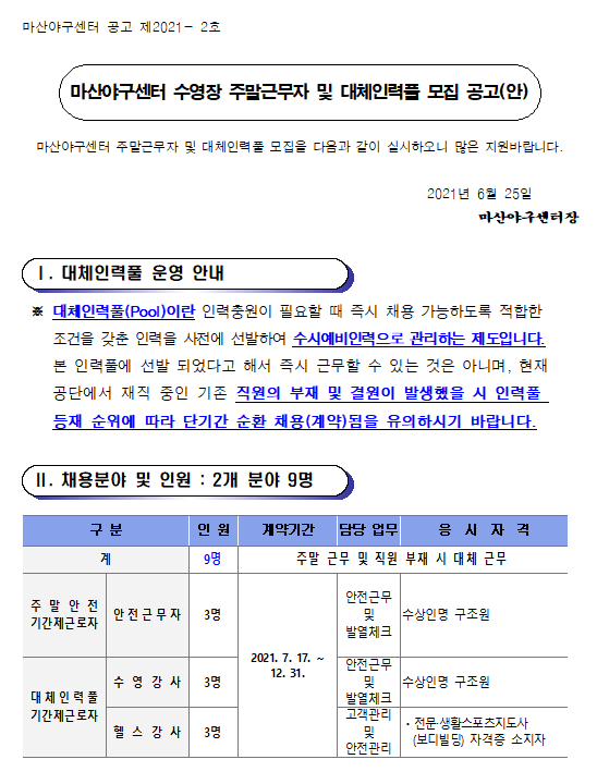 마산야구센터 수영장 주말근무자 및 대체인력풀 모집 공고