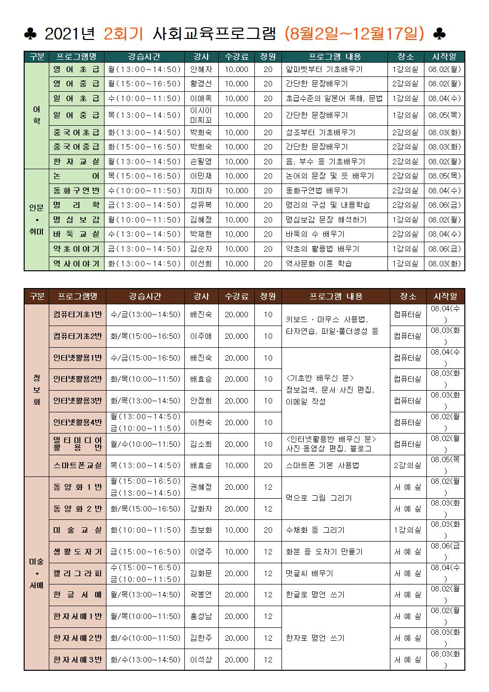 성산노인종합복지관 2021년 2회기(2021. 8. 2. ~ 12.17.) 사회교육 프로그램 수강생을