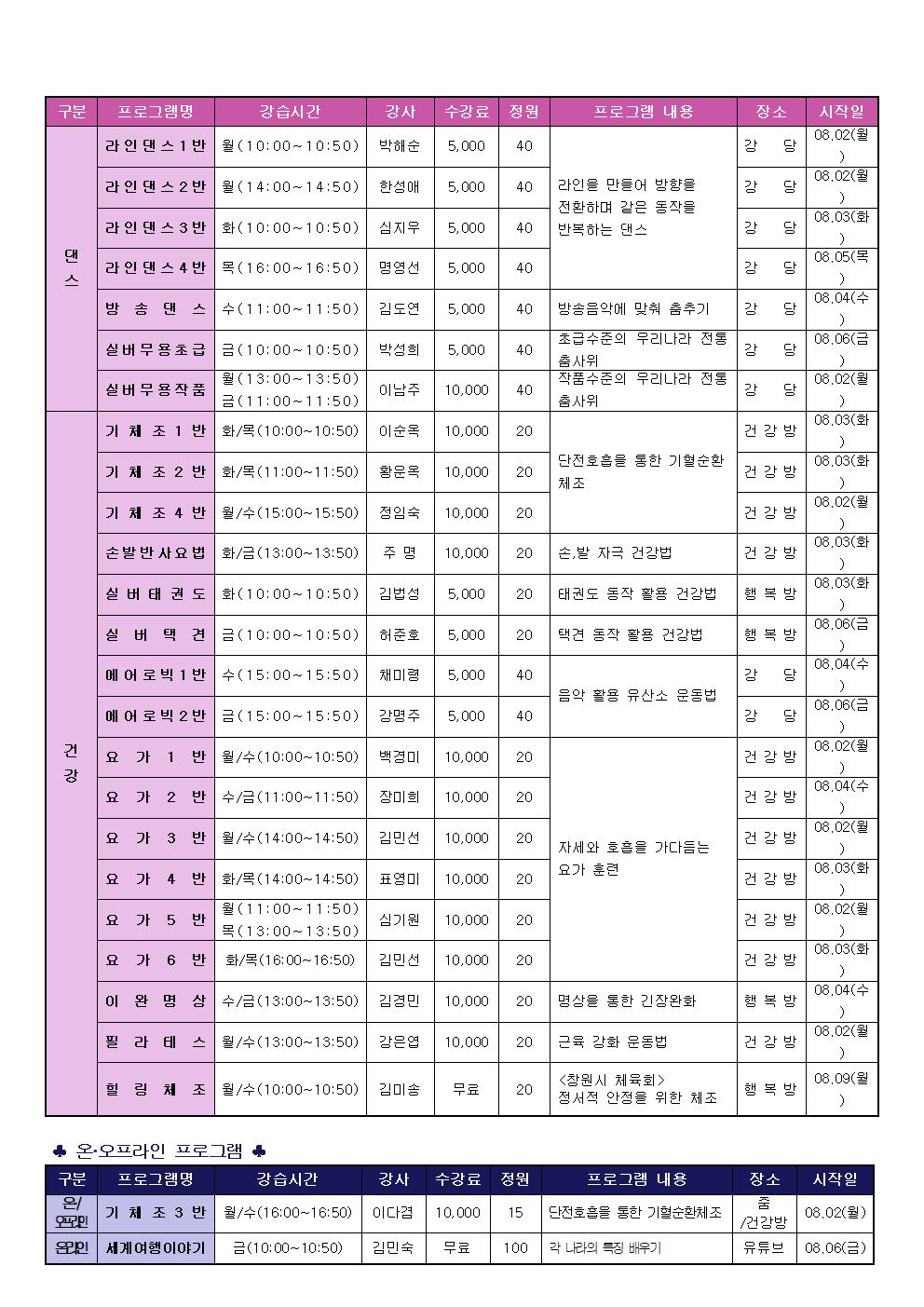 1. 수강신청 마감일 7.15(목), 17시 이후의 전화접수 및 온라인 접수는 프로그램 신청으로