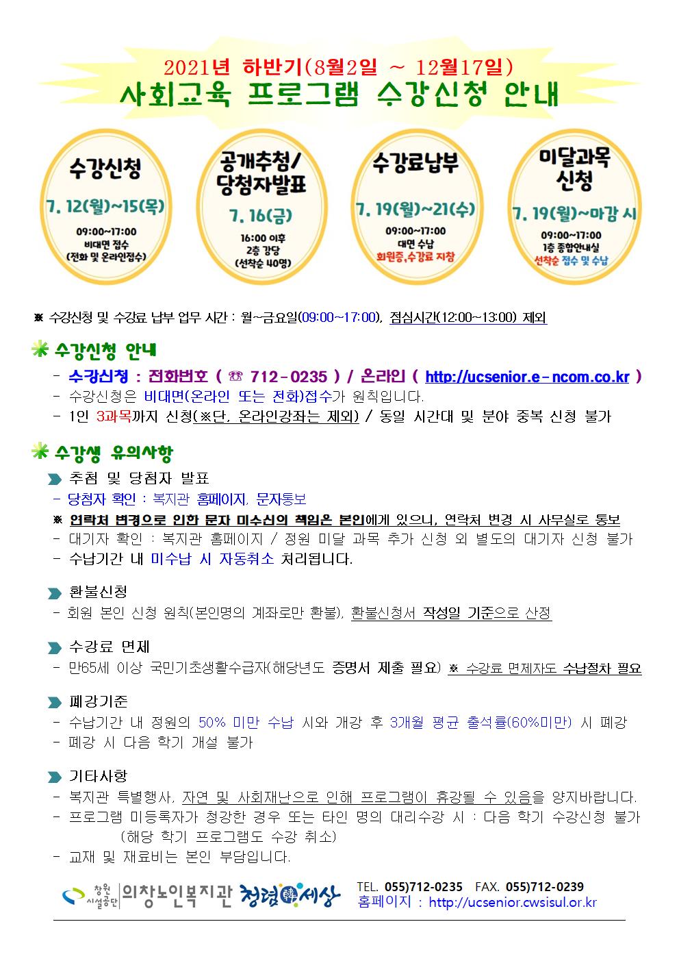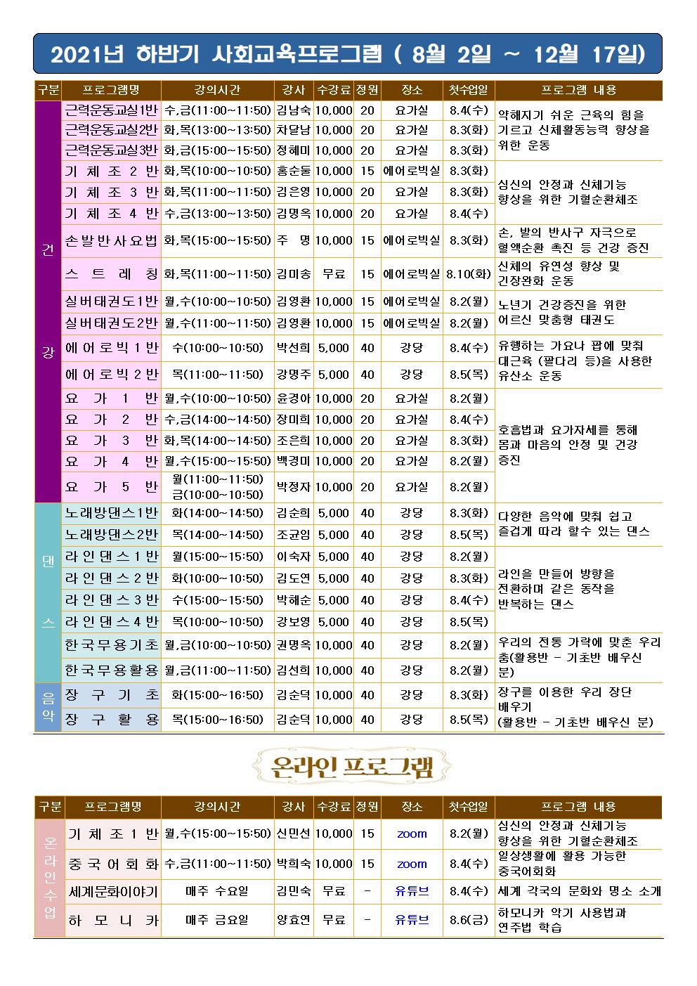 << 2021년 하반기(8~12월) 사회교육프로그램 수강 신청>>