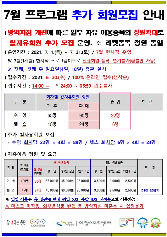 7월 수영, 헬스 프로그램 추가 회원모집 안내