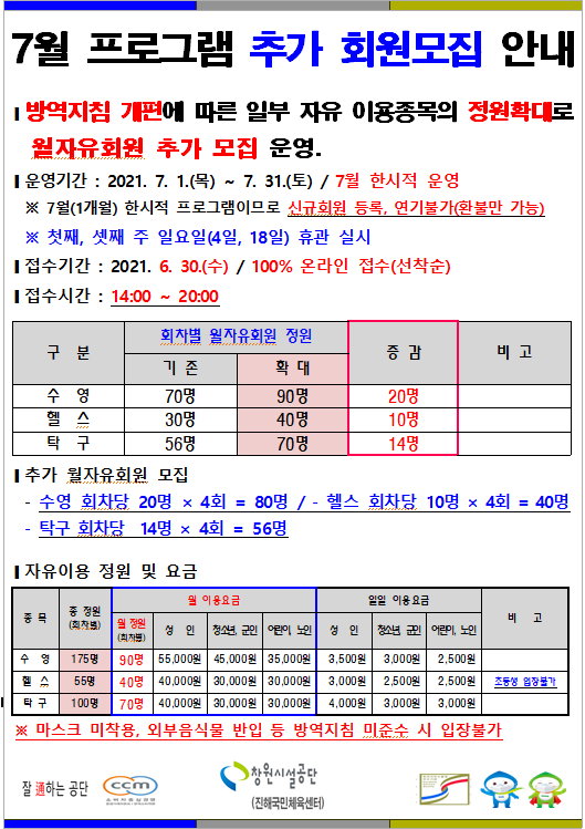 7월 거리두기 조정에따른 추가 회원 모집 안내