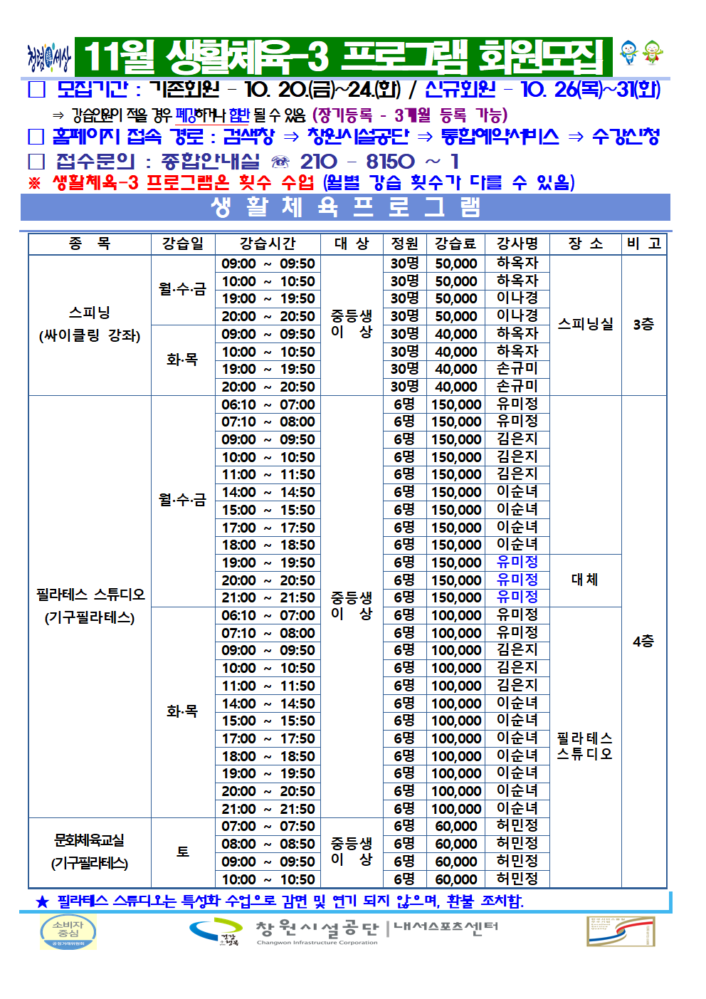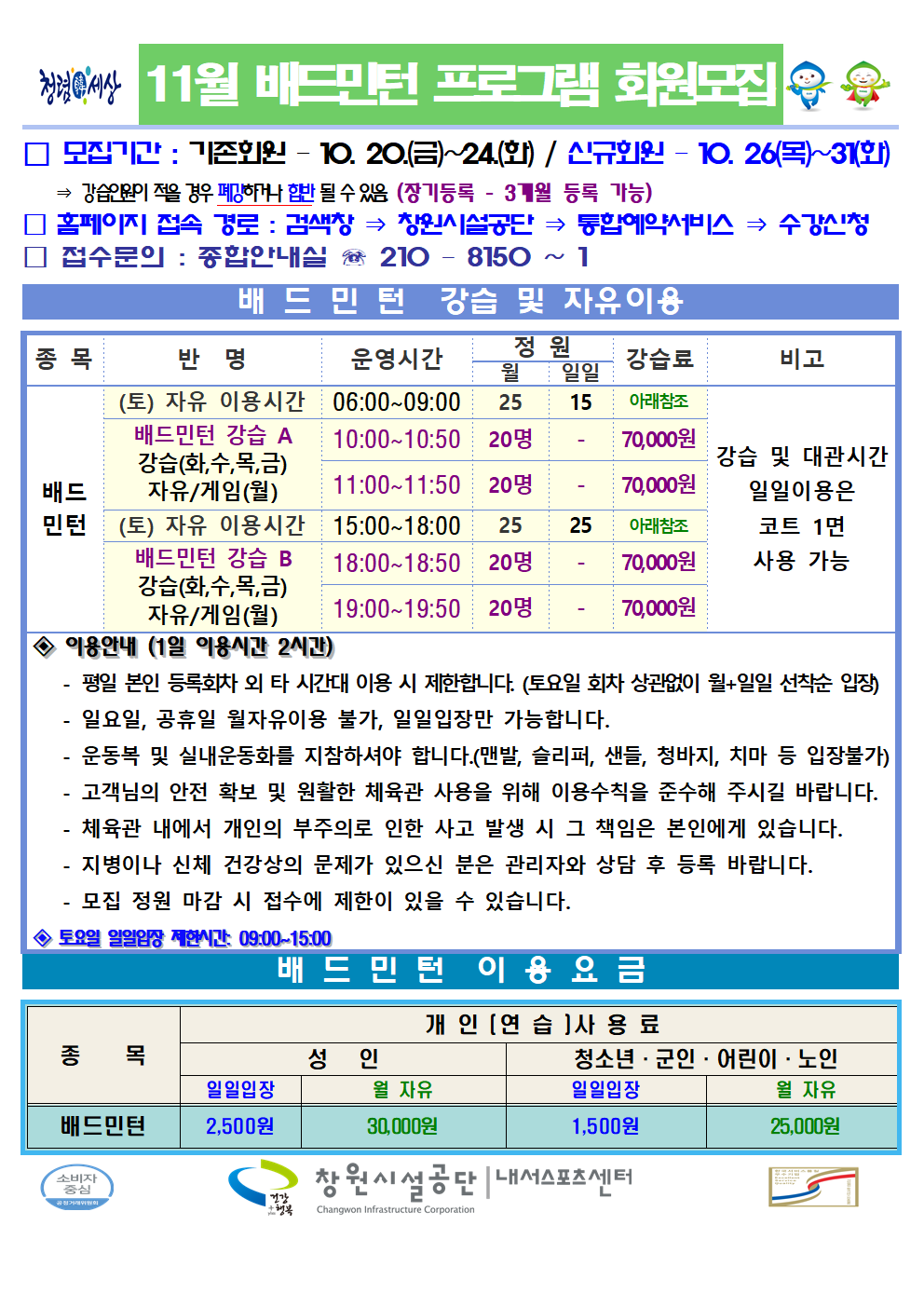 창원시립테니스장 11월 테니스 강습 회원 모집 안내