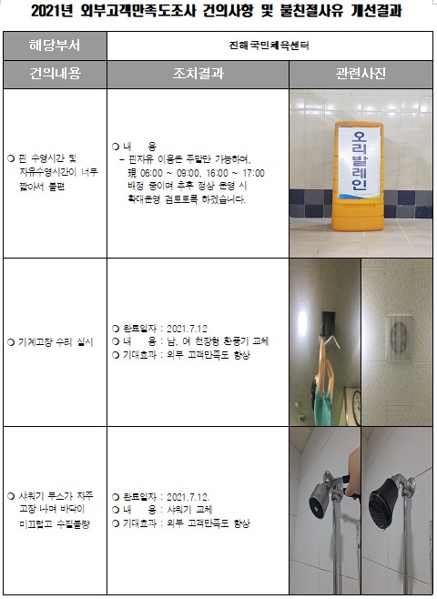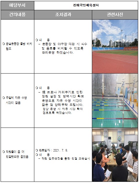 [내서스포츠센터] 2021년 외부고객만족도 및 직원친절도 건의사항 개선 결과