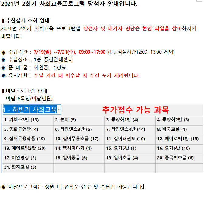 2021년 2회기 사회교육프로그램 당첨자 및 미달과목 안내