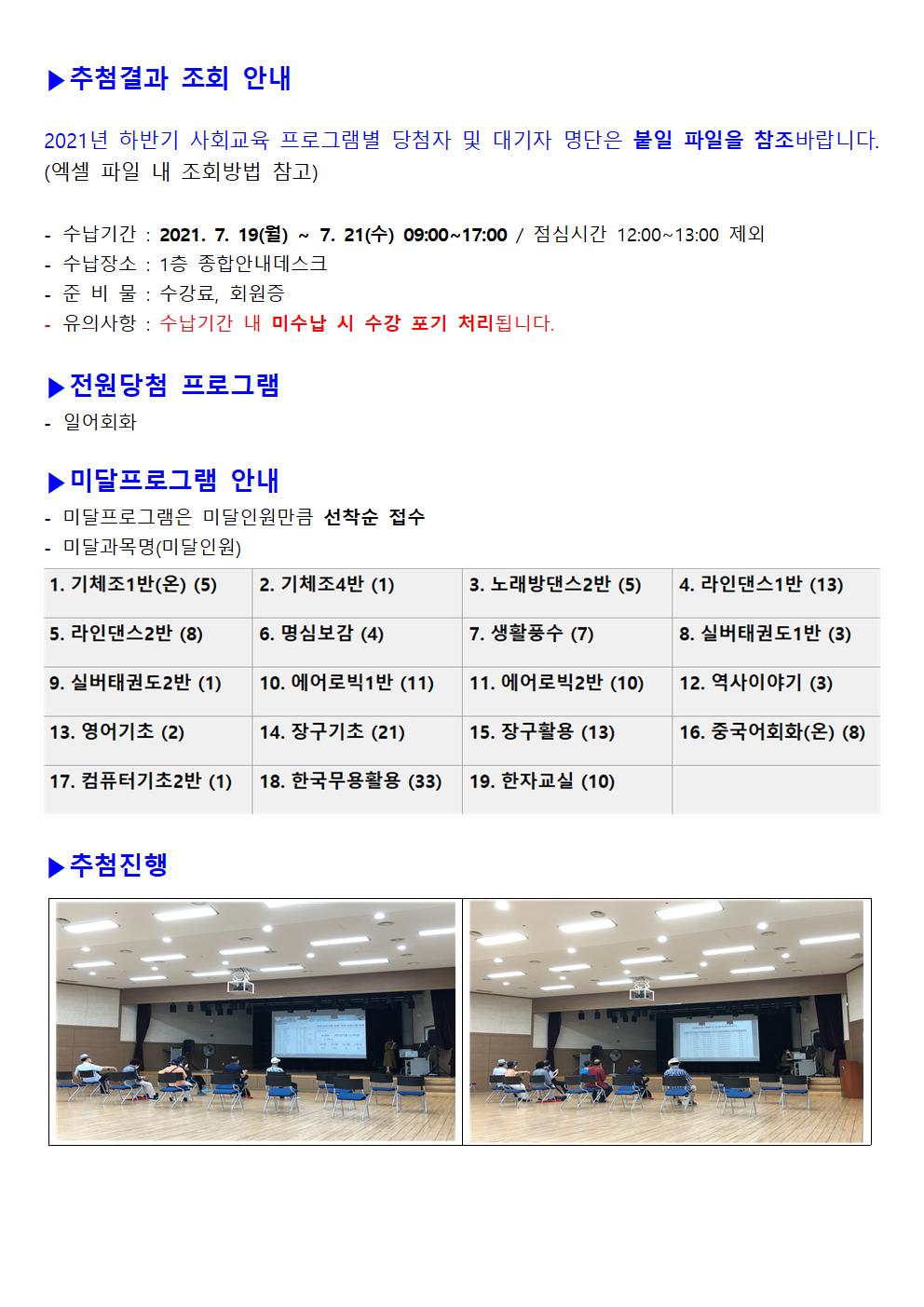 2021년 하반기 사회교육프로그램 당첨자 및 미달과목 안내