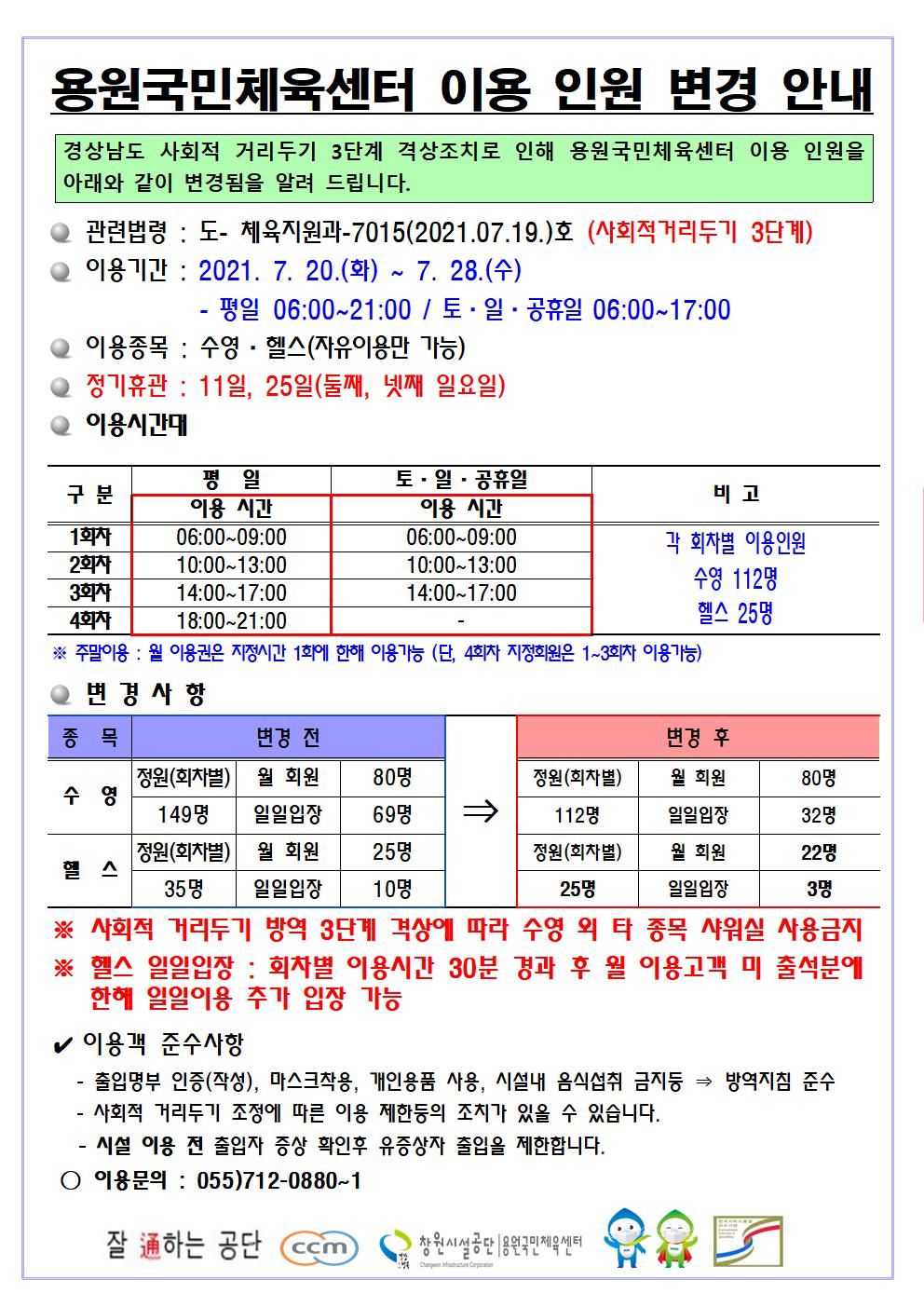 사회적 거리두기 3단계 격상에 따른 이용 인원 변경 안내