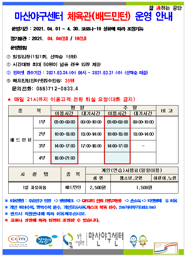 마산야구센터 체육관(배드민턴) 4월 운영 안내