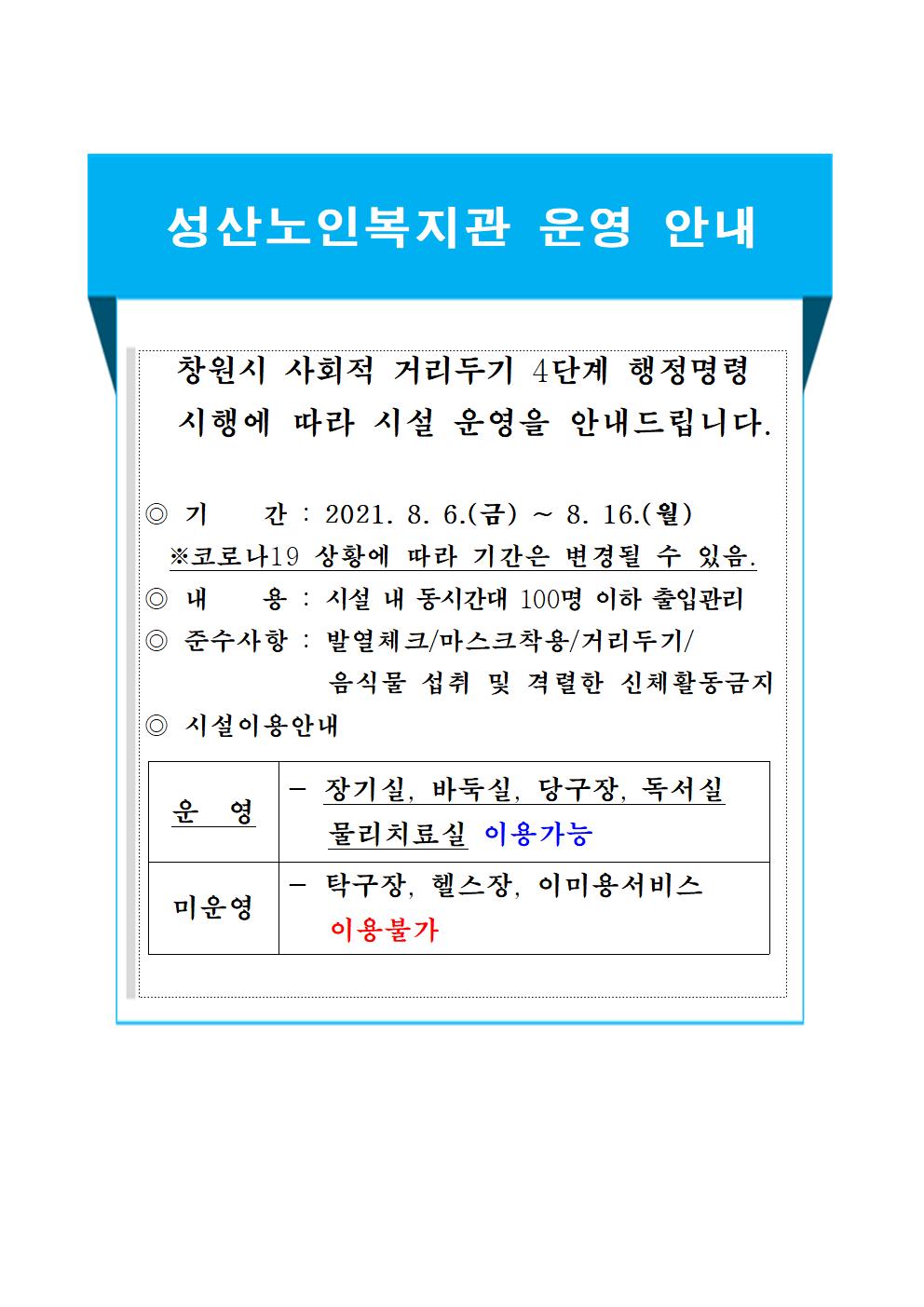 사회적 거리두기 4단계 격상에 따른 복지관 운영안내