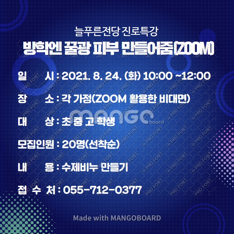 청소년 진로특강 「방학에 놀면 뭐하니?」 참가자를 모집합니다. 줌(ZOOM)으로 진행하며 무료로 운영되오니 참고하시기 바랍니다.