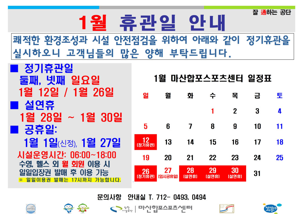 정기휴관일: 둘째 일요일(1월 12일), 넷째 일요일(1월 26일)