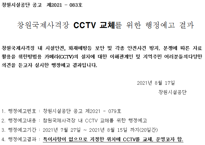창원국제사격장 내 CCTV 교체를 위한 행정예고 결과 공고