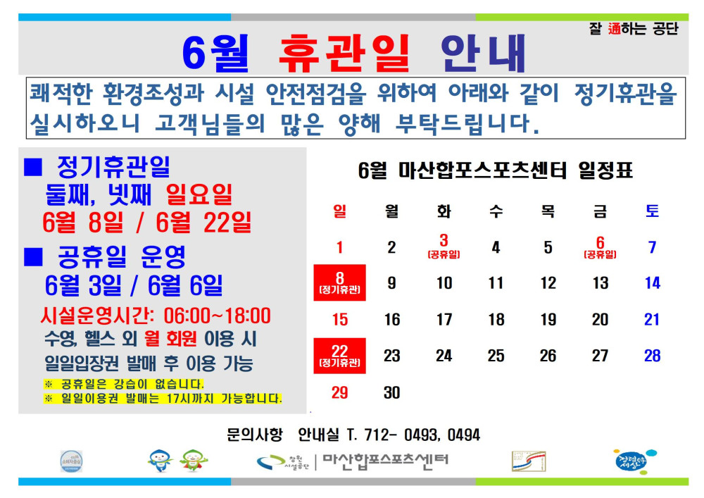 6월 정기휴관일 및 공휴일 안내 상세보기