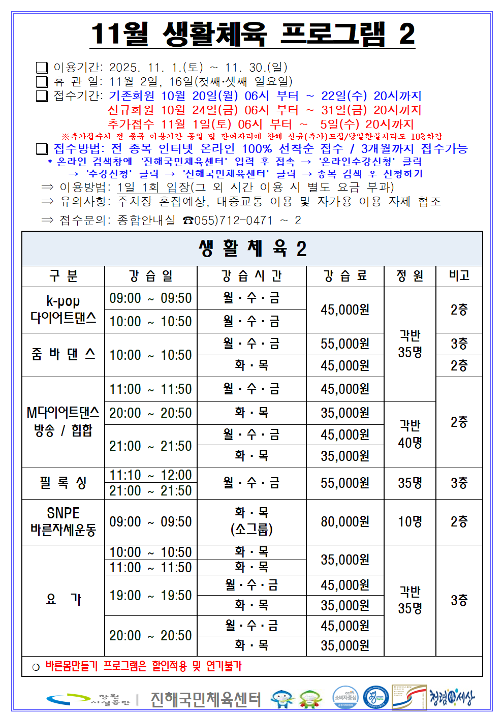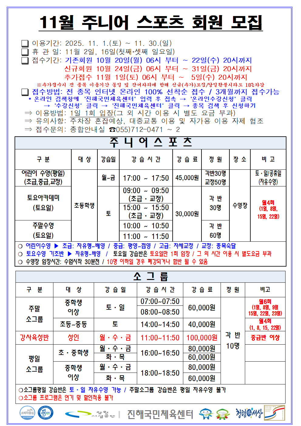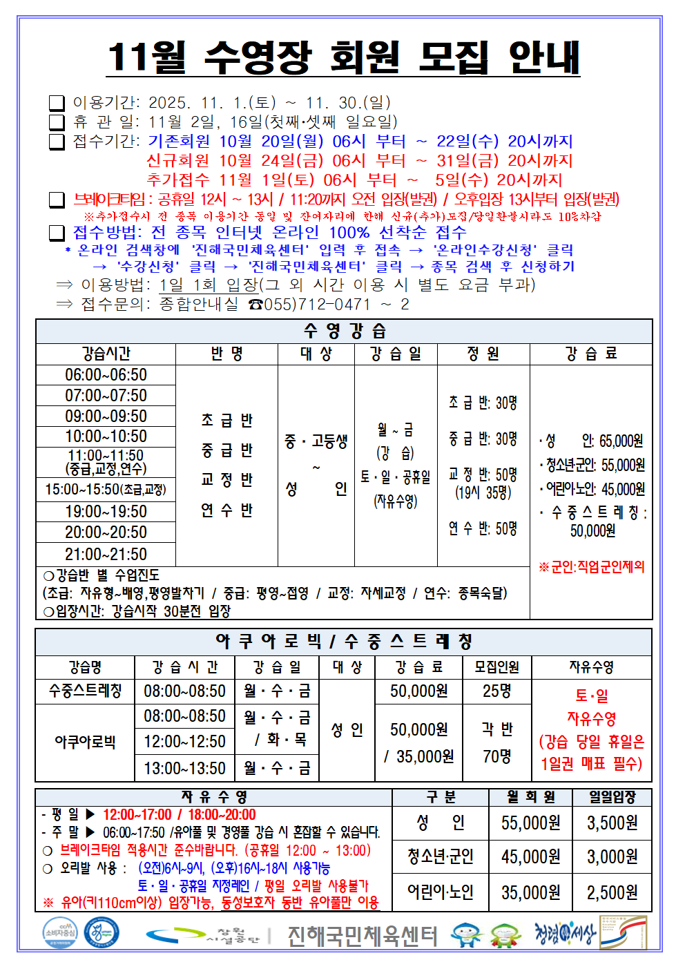 11월 프로그램 운영 / 수영 강습별 수영강사 / 11월 휴장 안내입니다.