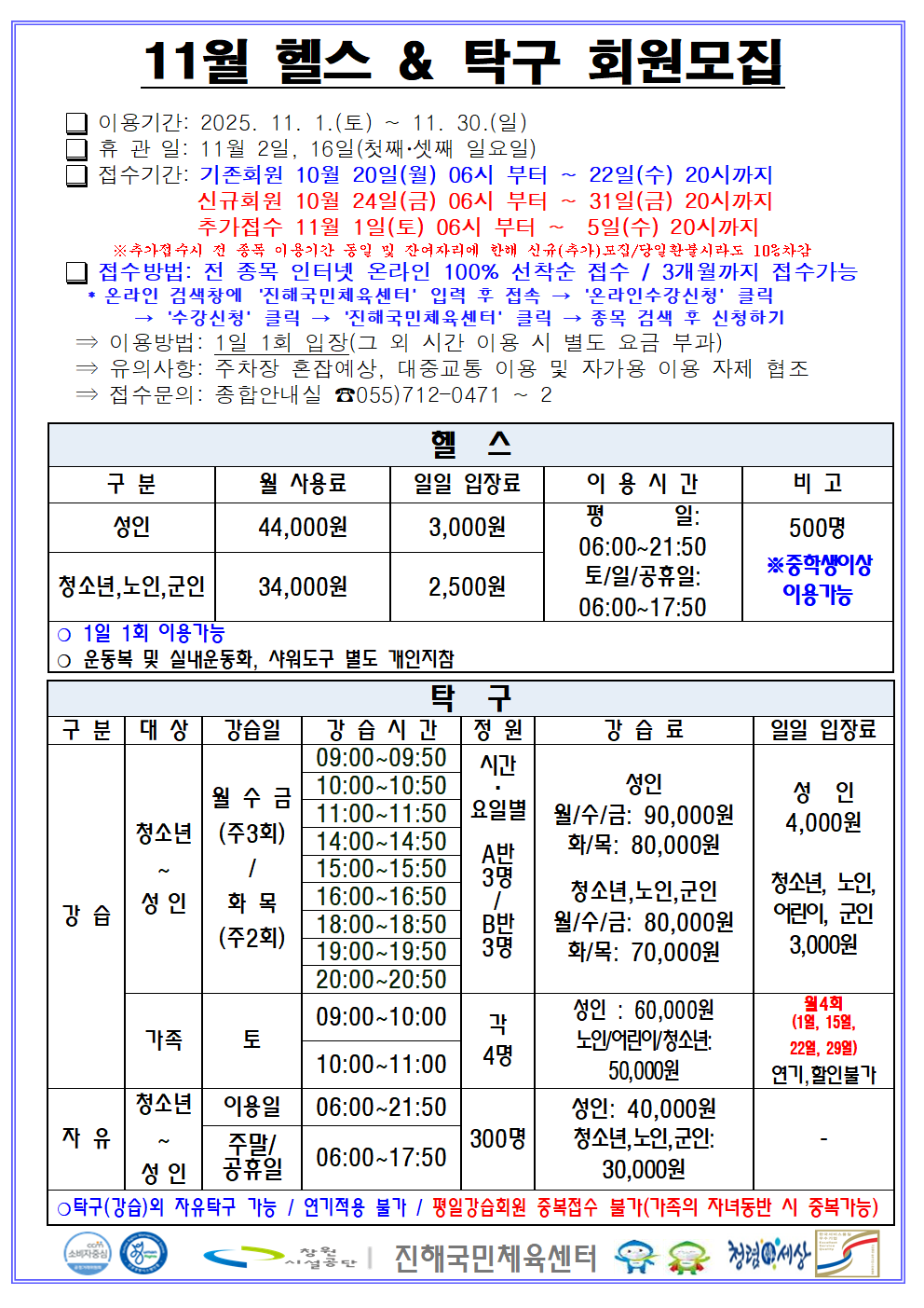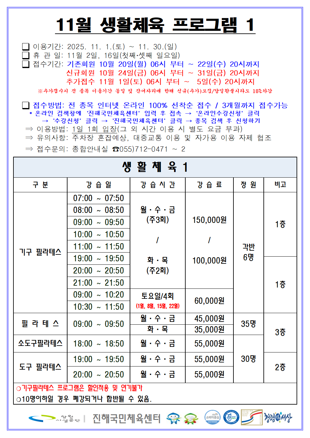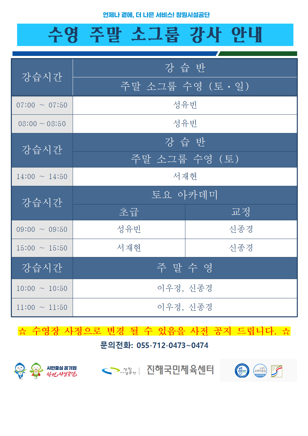 11월 프로그램 운영 / 수영 강습별 수영강사 / 11월 휴장 안내입니다.
