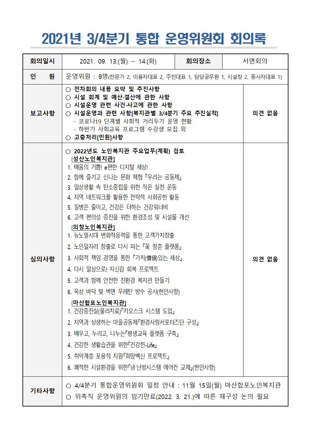 2021년 3/4분기 통합 노인복지관 운영위원회 결과