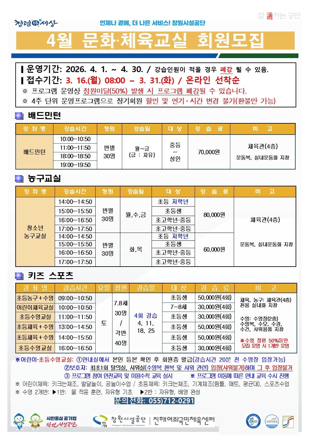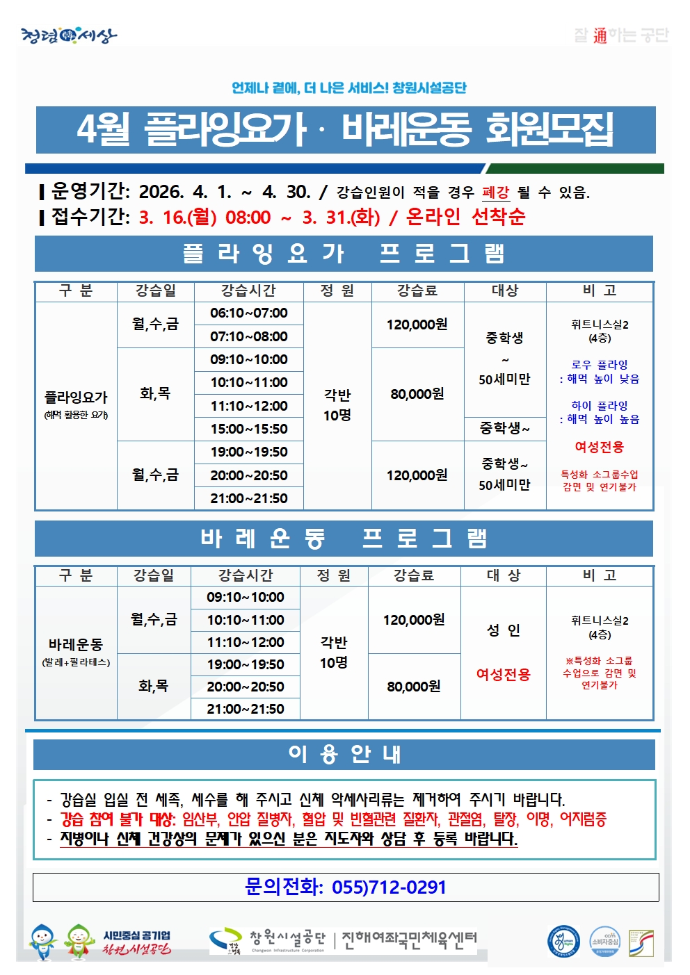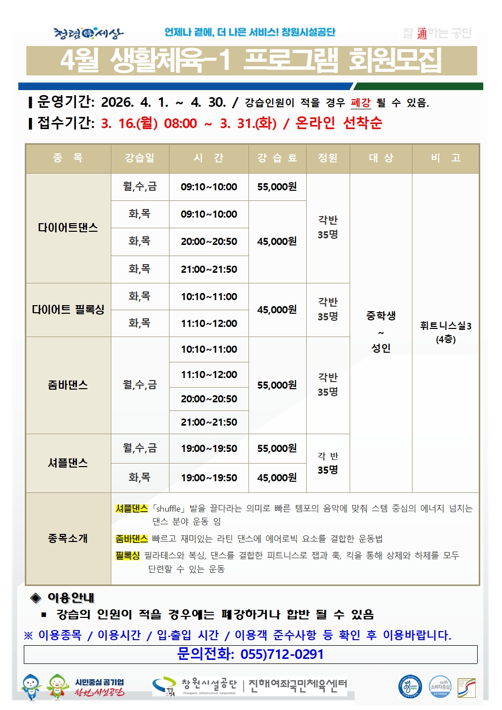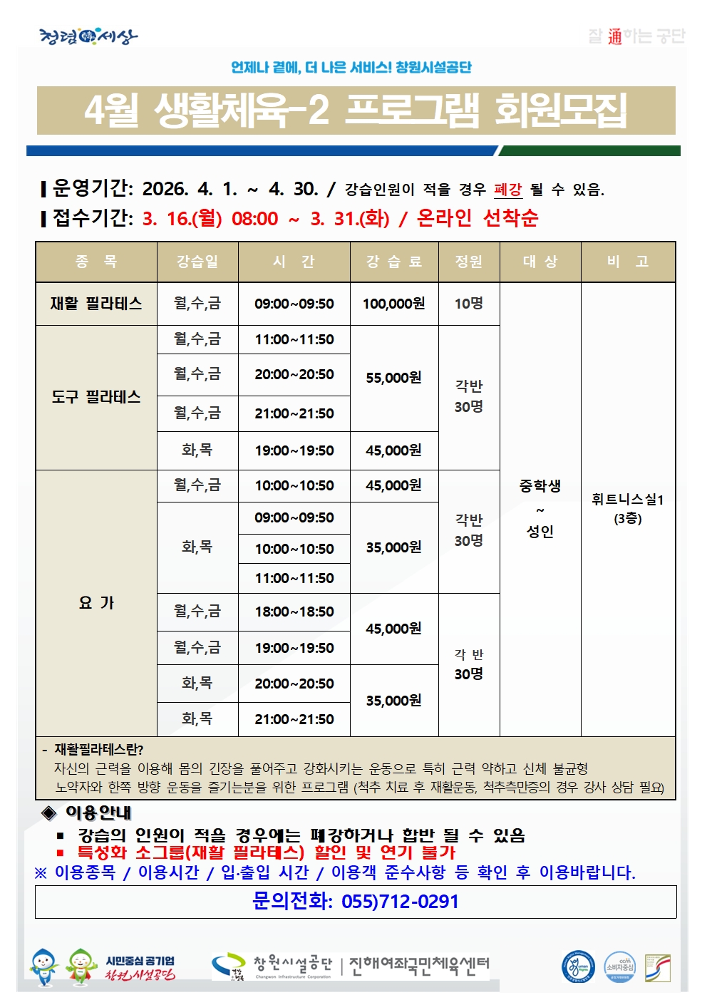4월 여좌국민체육센터 프로그램 회원 모집