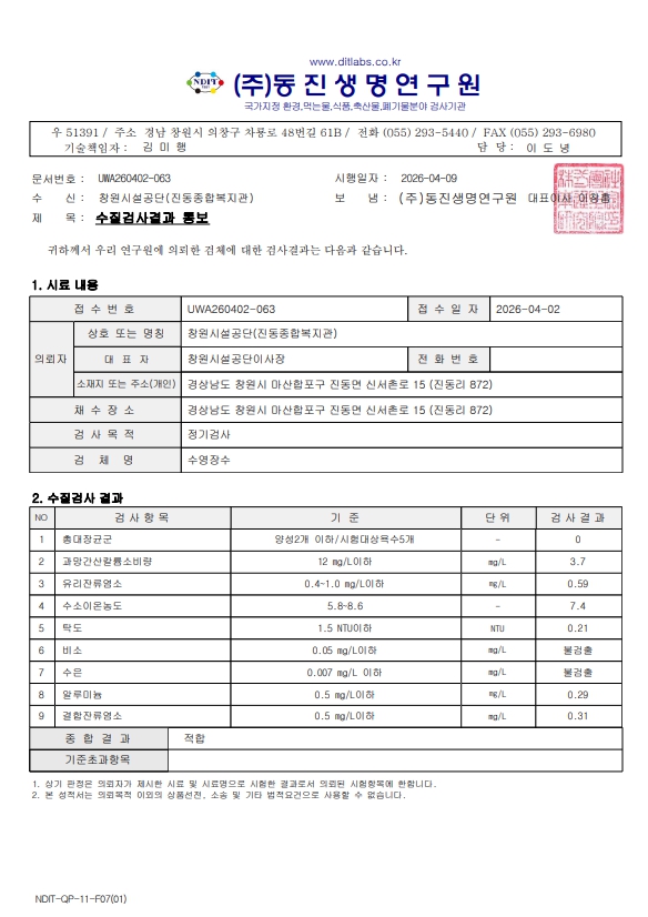 수영장 수질검사 결과 공지 합니다.