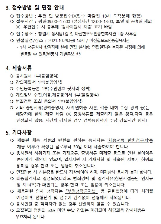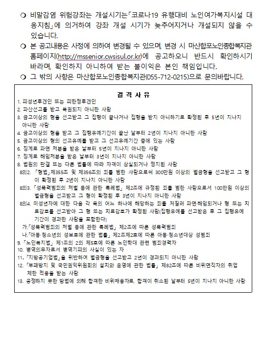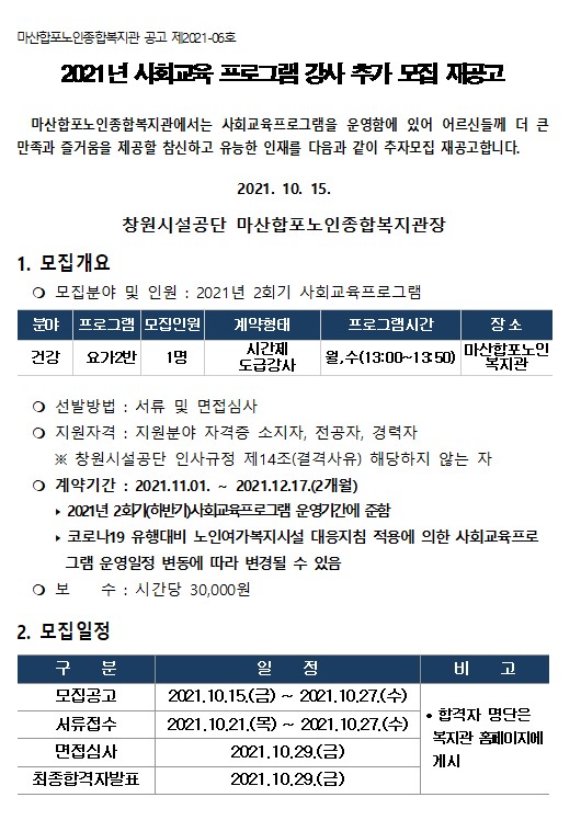 마산합포노인복지관 '2021년 사회교육프로그램 강사 추가 모집 재공고' 안내