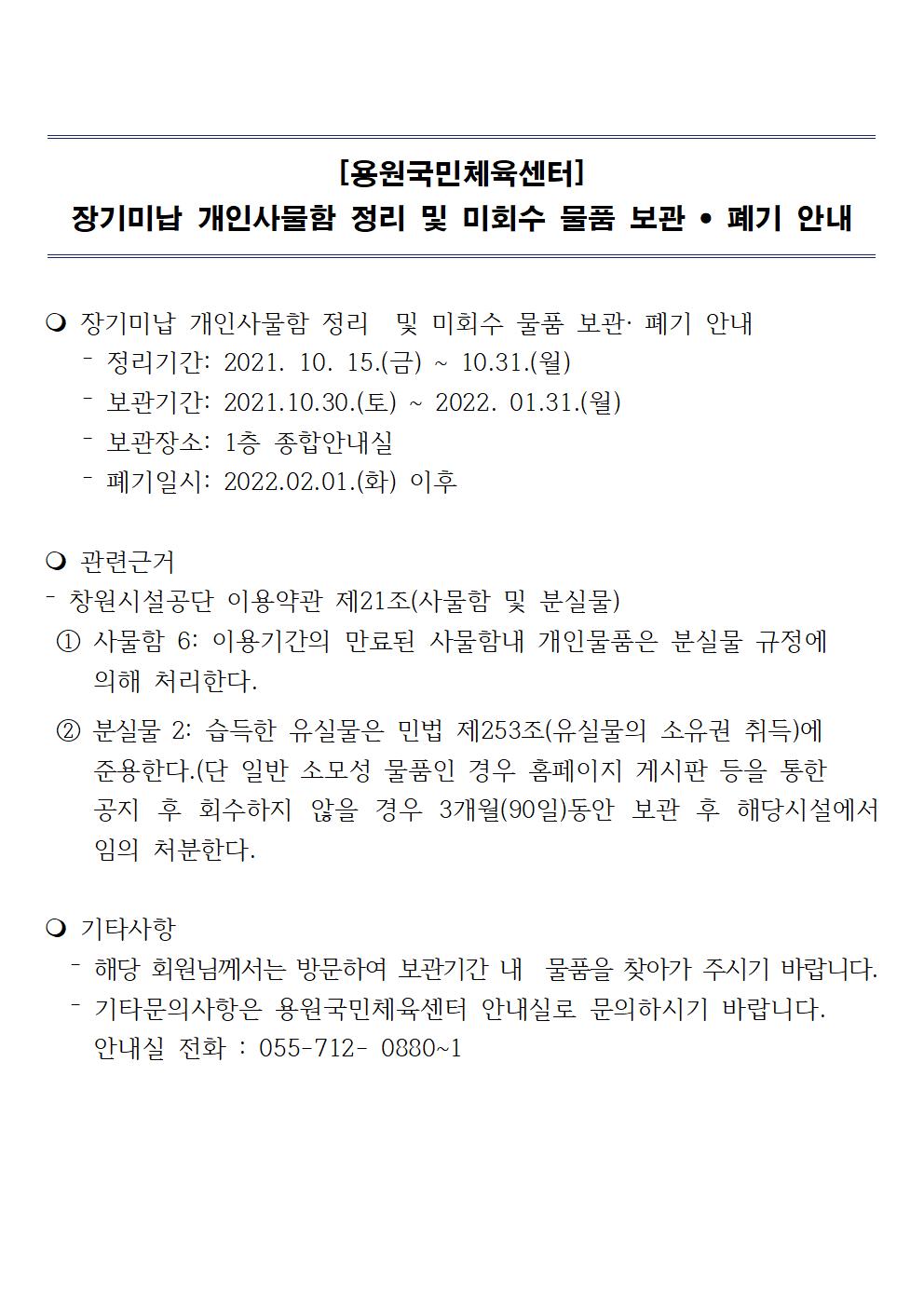 장기미납 개인사물함 정리 및 미회수 물품 보관 • 폐기 안내