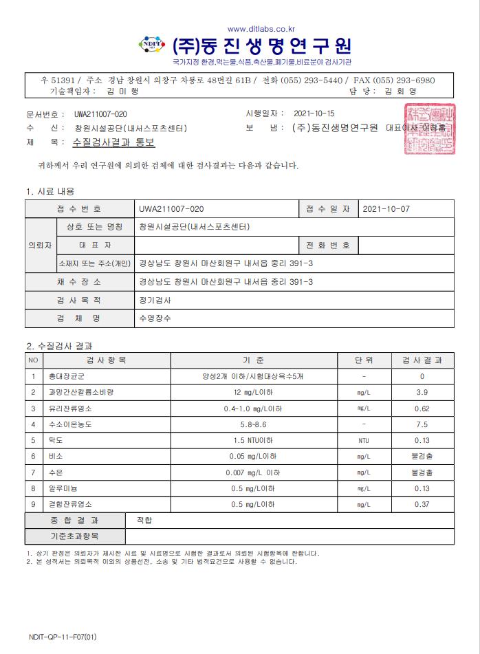 2021년 10월 수질검사 결과 안내