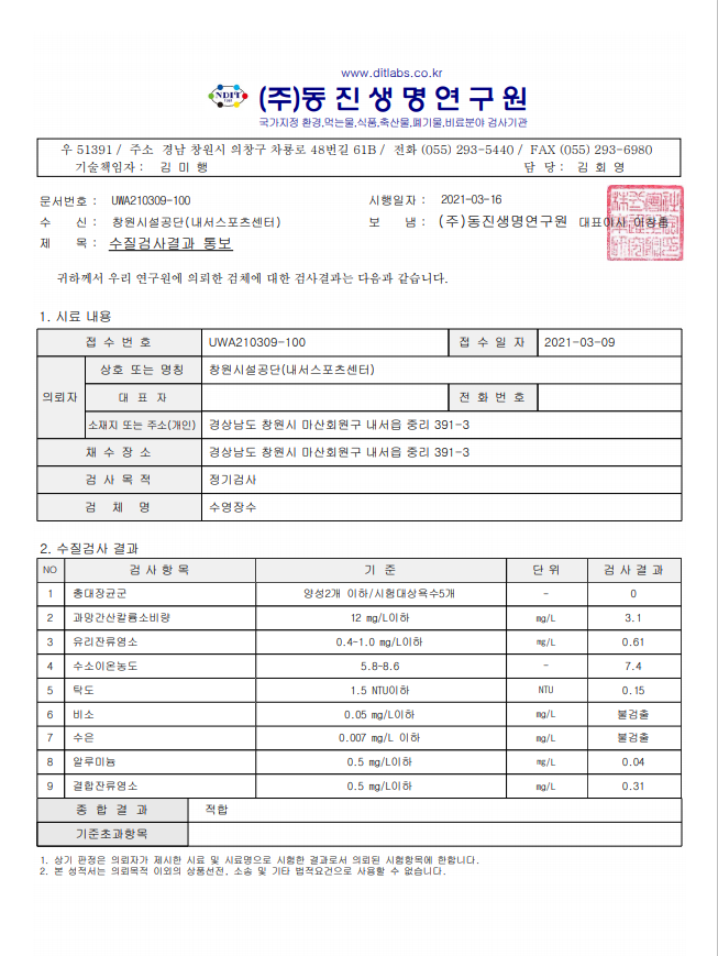 2021년 3월 수질검사 결과 안내