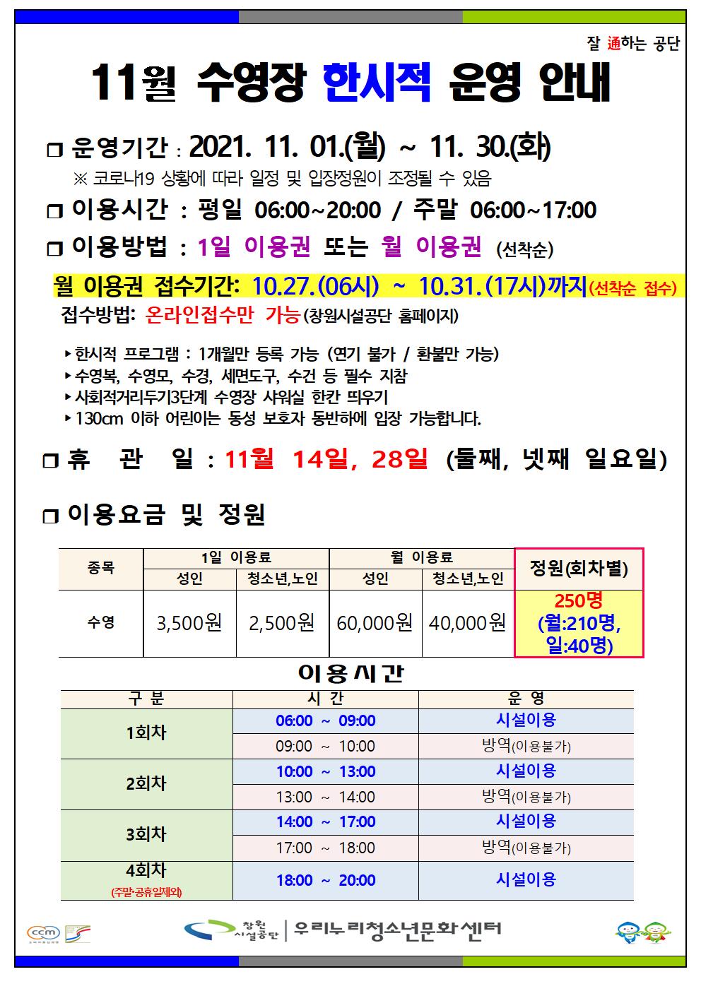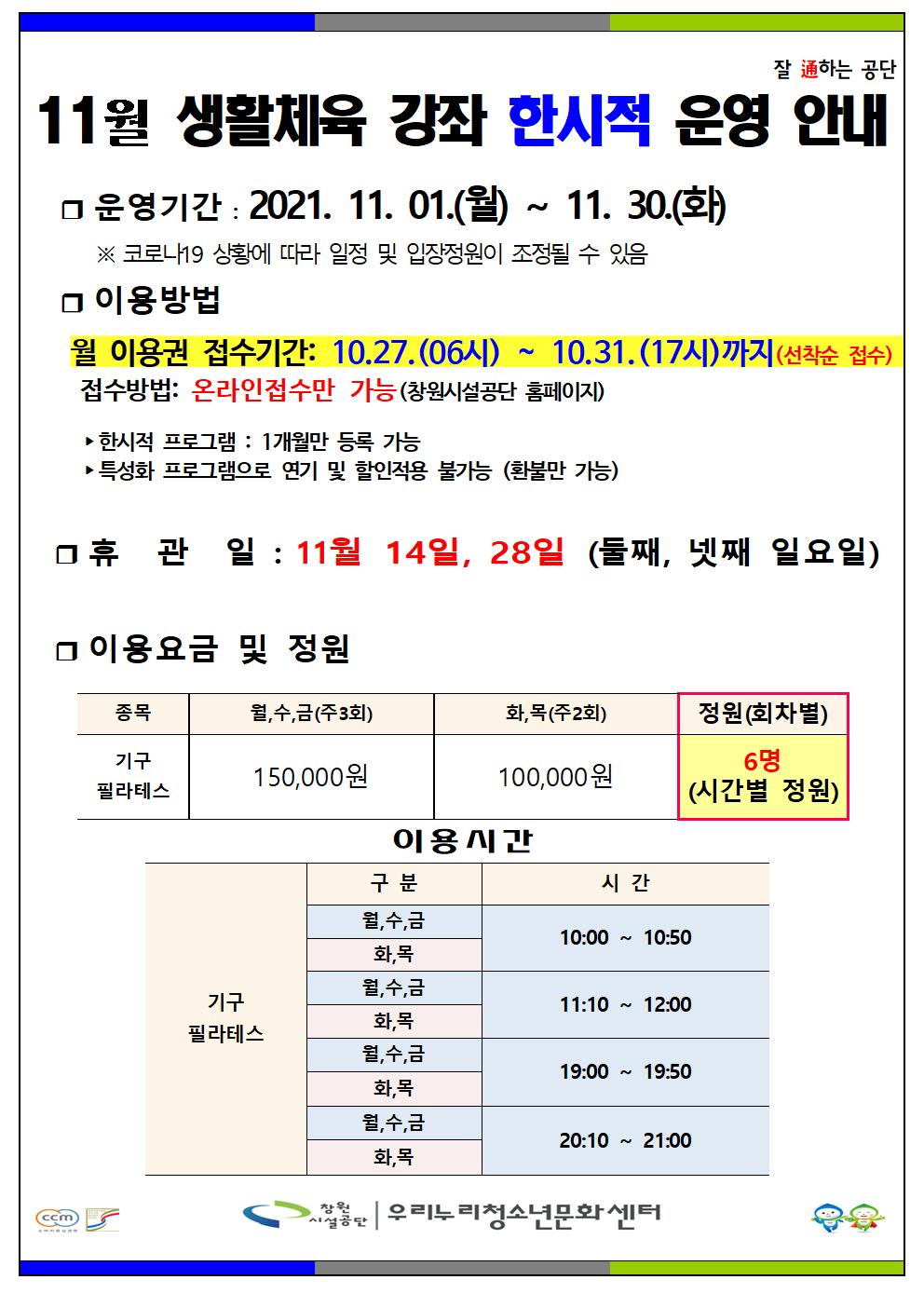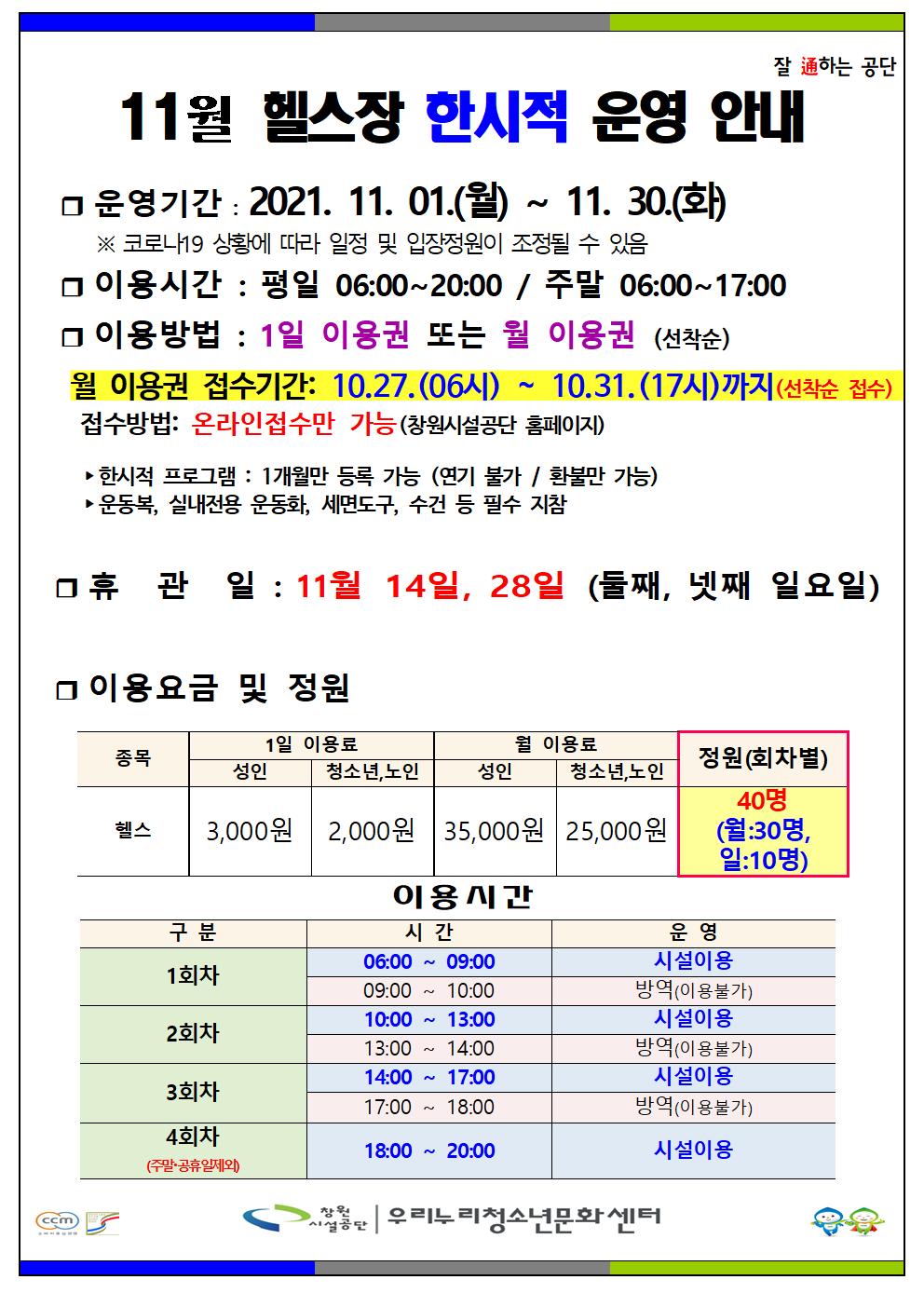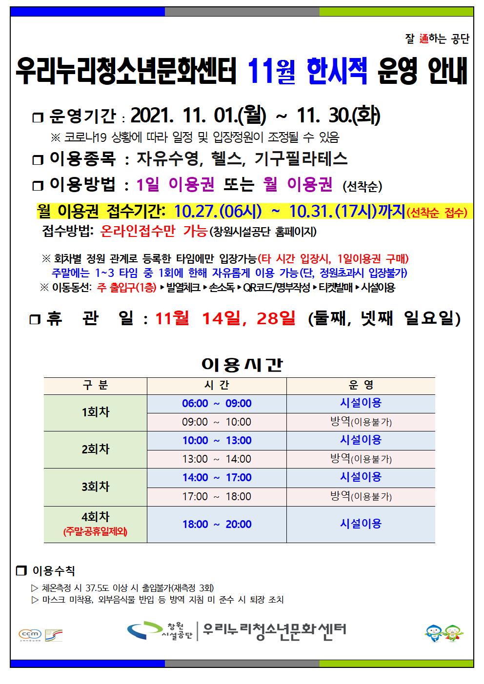우리누리청소년문화센터 11월 한시적 운영 안내