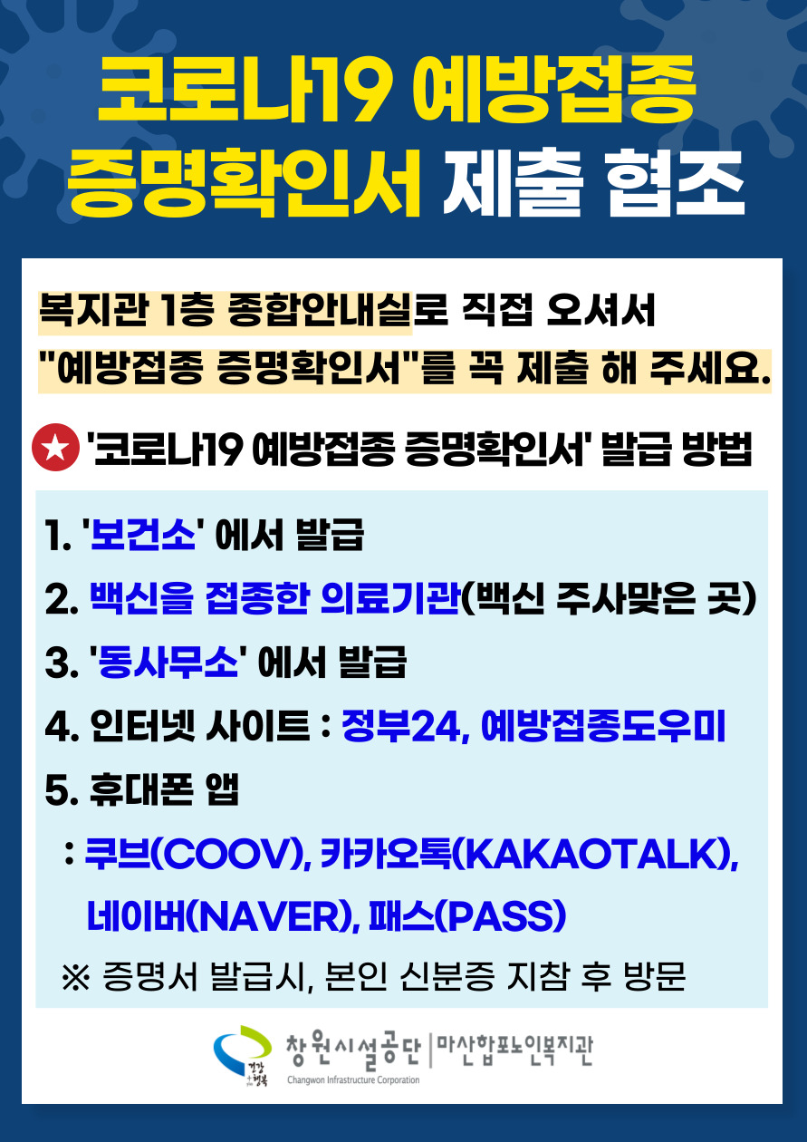 복지관 출입 시 "코로나 19 예방접종 증명확인서" 를 확인하고 있습니다.