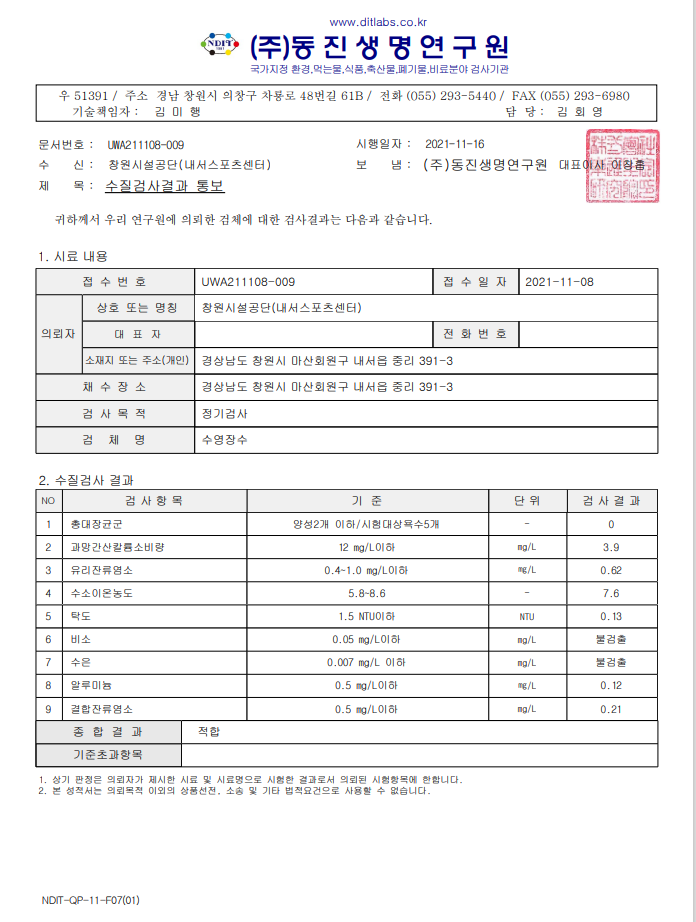 11월 수질검사 결과 안내