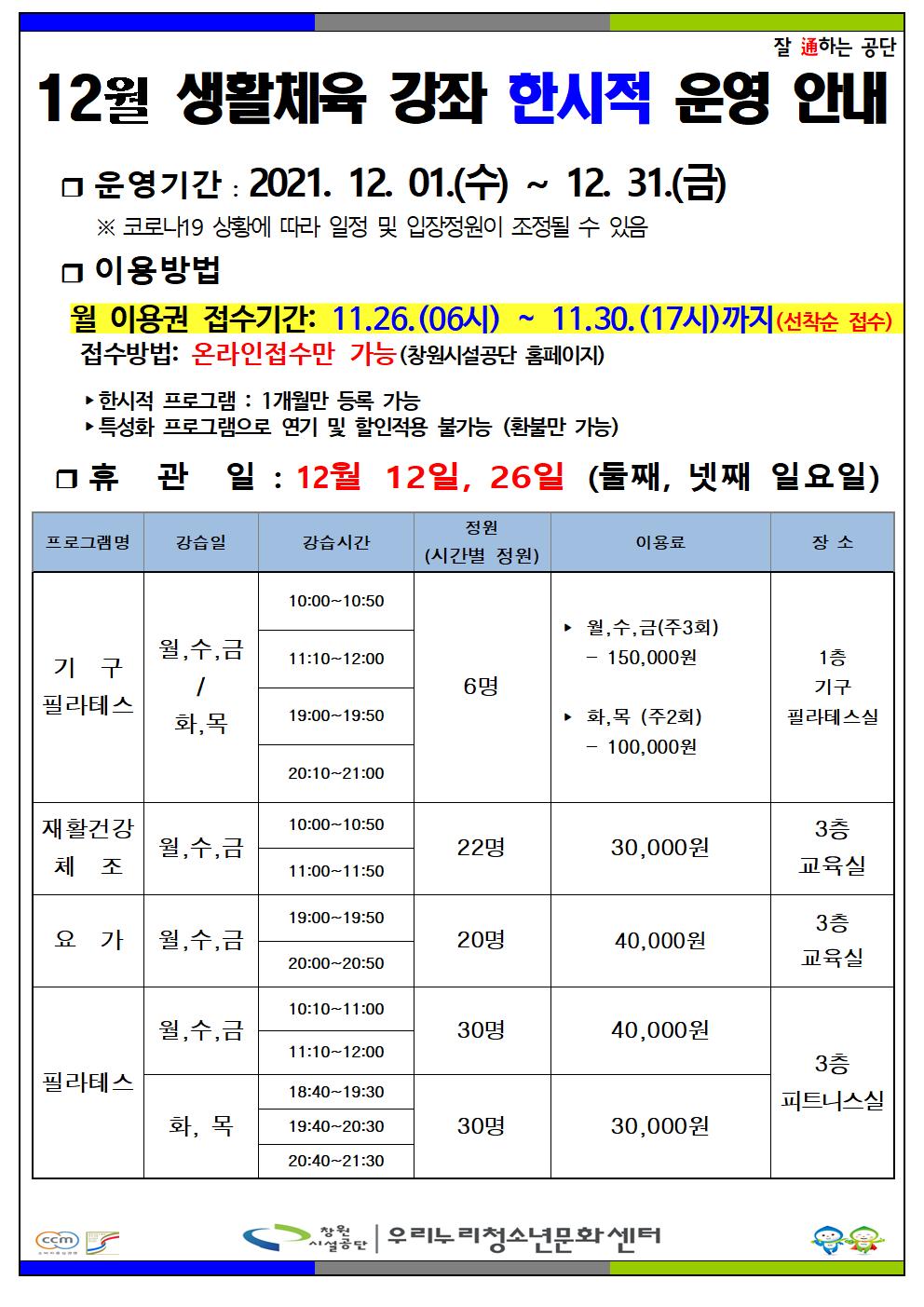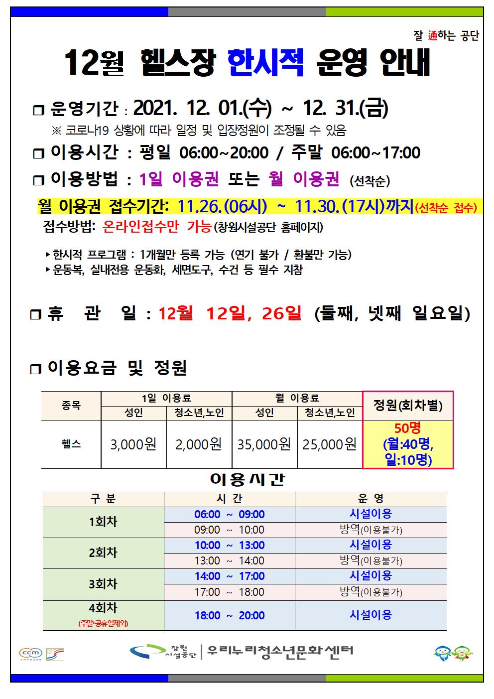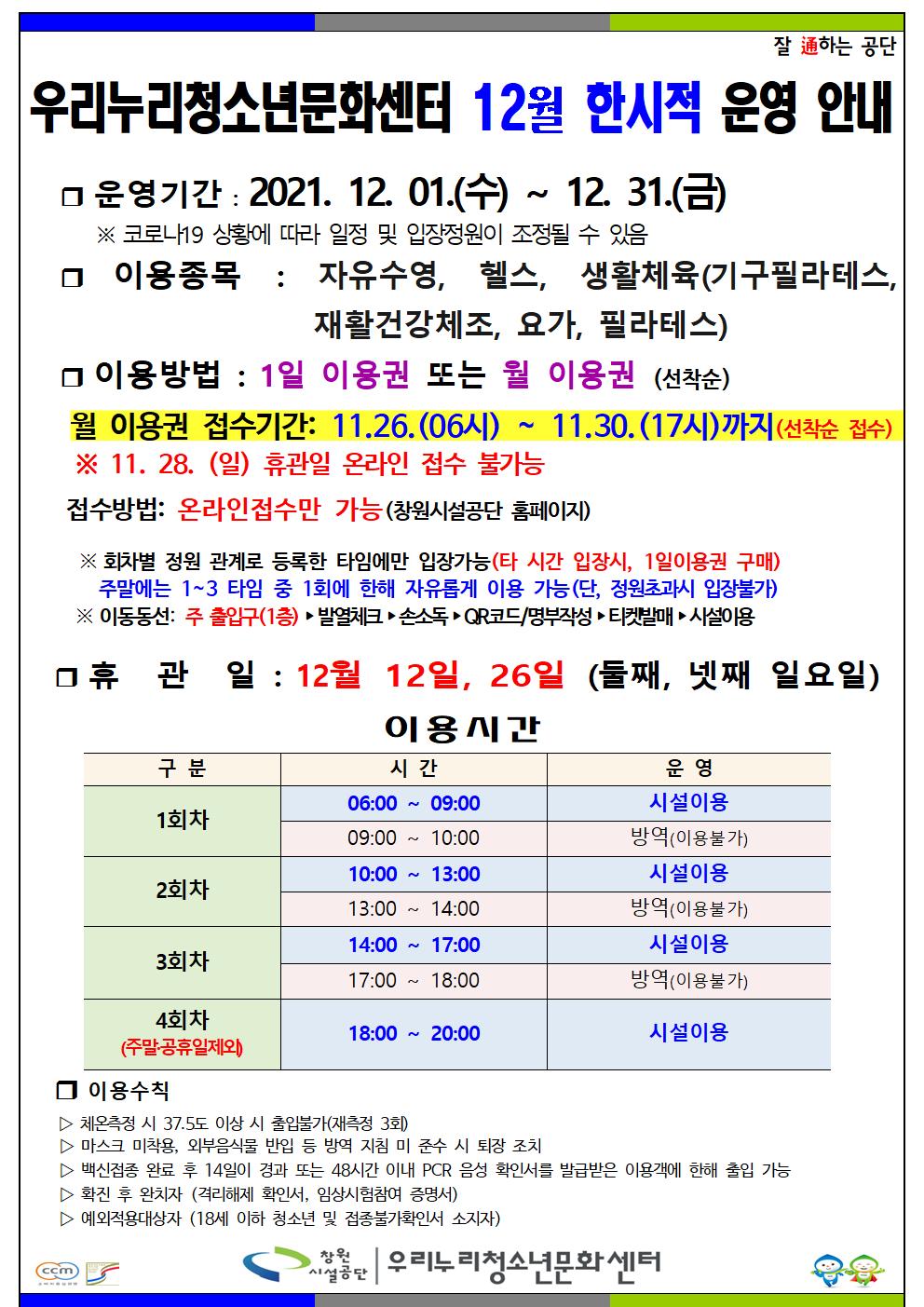 우리누리청소년문화센터 12월 한시적 운영 안내
