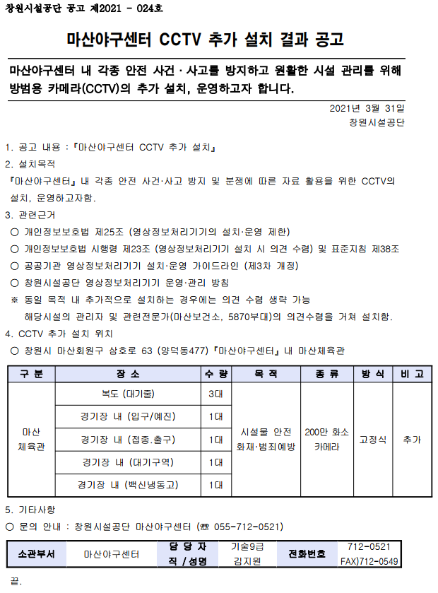 마산야구센터 CCTV 추가 설치 결과 공고