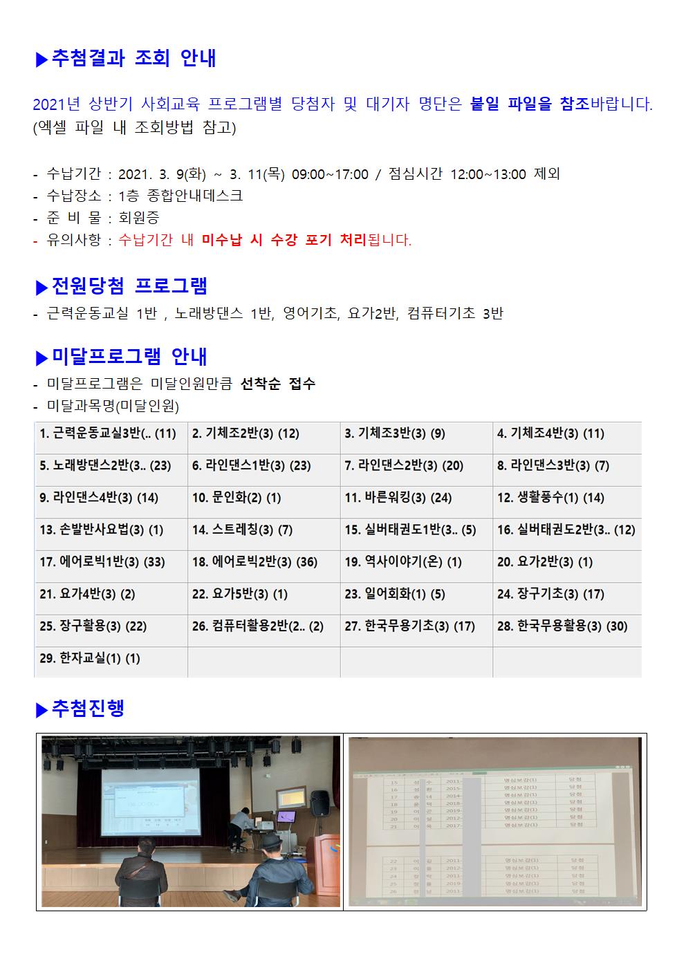 2021년 상반기 사회교육프로그램 추첨 결과 안내