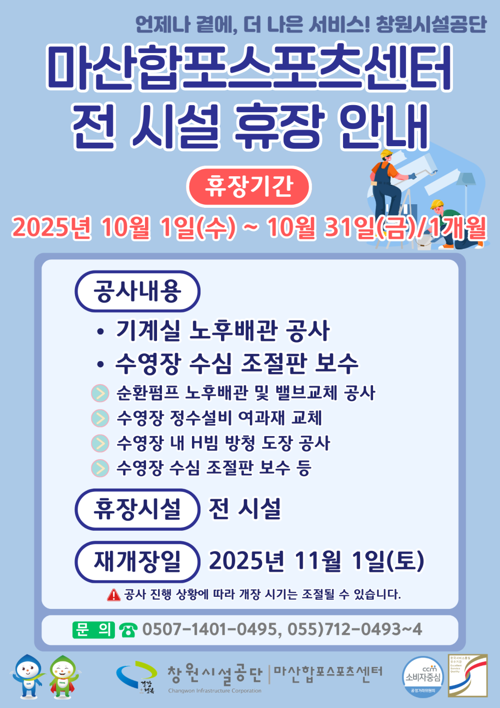 [마산합포스포츠센터 전 시설 휴장 안내]노후 시설물 보수를 위해 전 시설 휴장하오니고객님들의 많은 양해 부탁드립니다.▶ 휴장기간: 2025. 10. 1.(수)~10. 31.(금)/1개월▶ 공사내용: 노후 시설 개선 공사▶ 휴장시설: 전 시설▶ 재개장일: 2025. 11. 1.(토)- 공사 진행 상황에 따라 개장 시기는 조정될 수 있습니다.