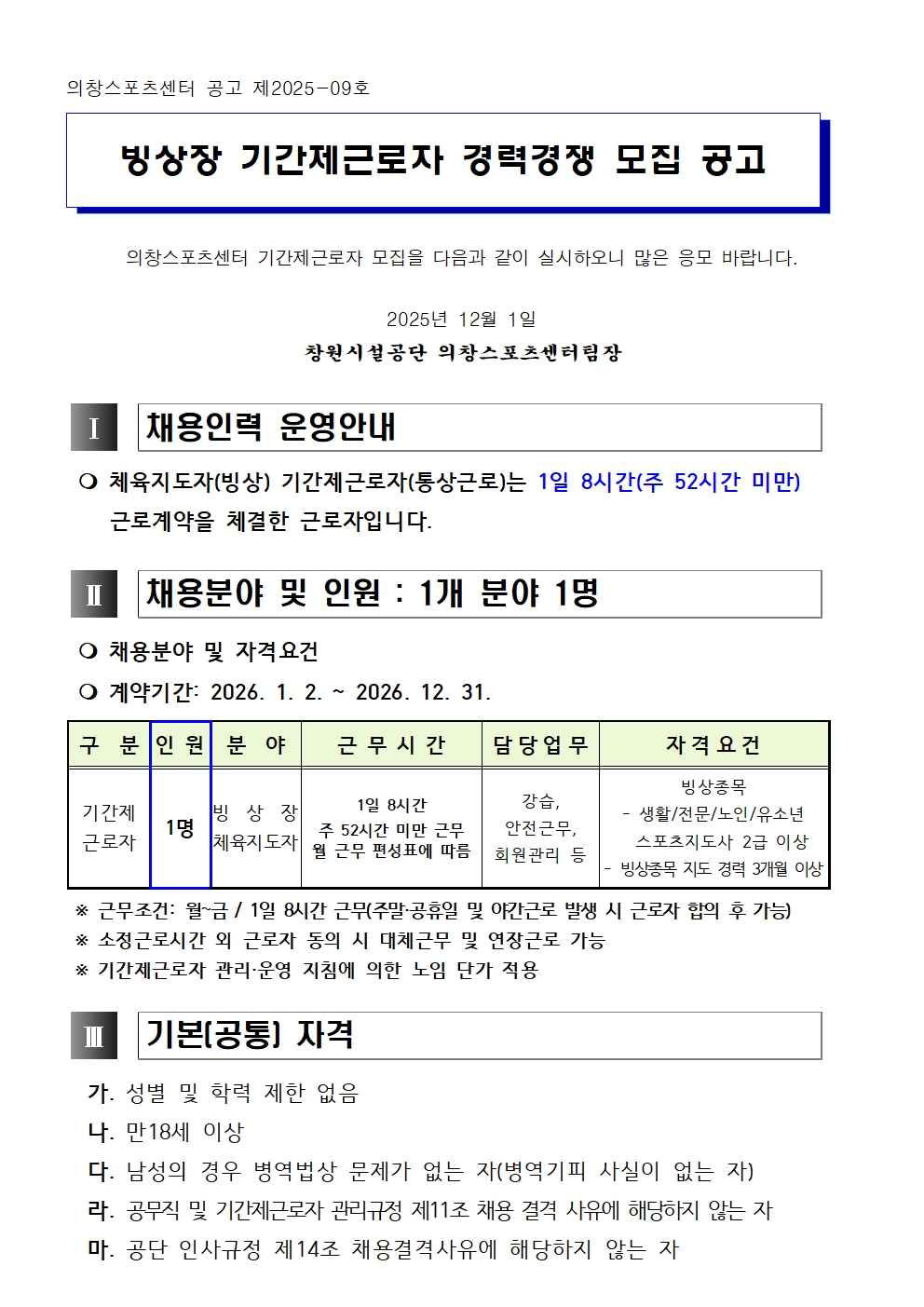 [의창스포츠센터팀] 빙상장 기간제근로자 경력경쟁 채용 모집 공고 상세보기