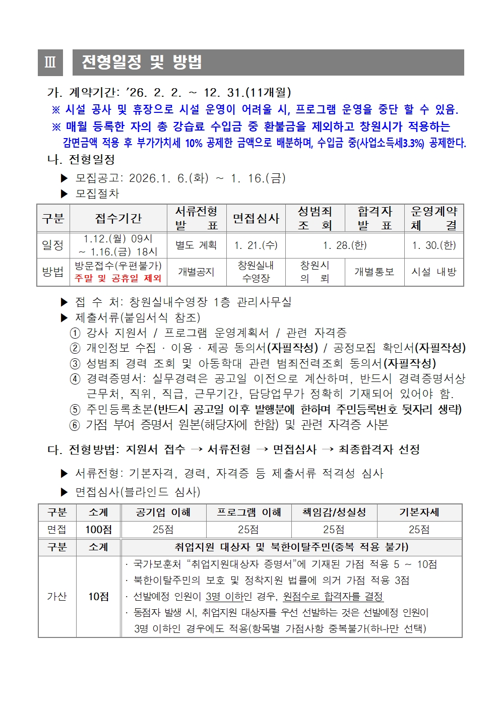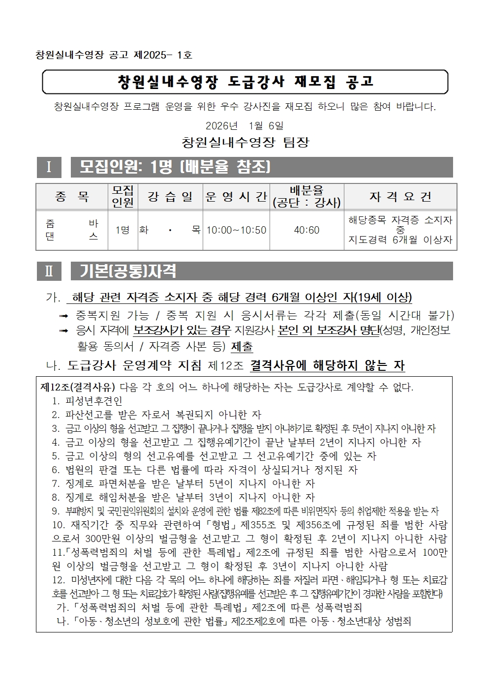 창원실내수영장 생활체육 프로그램 도급강사 재모집 공고입니다