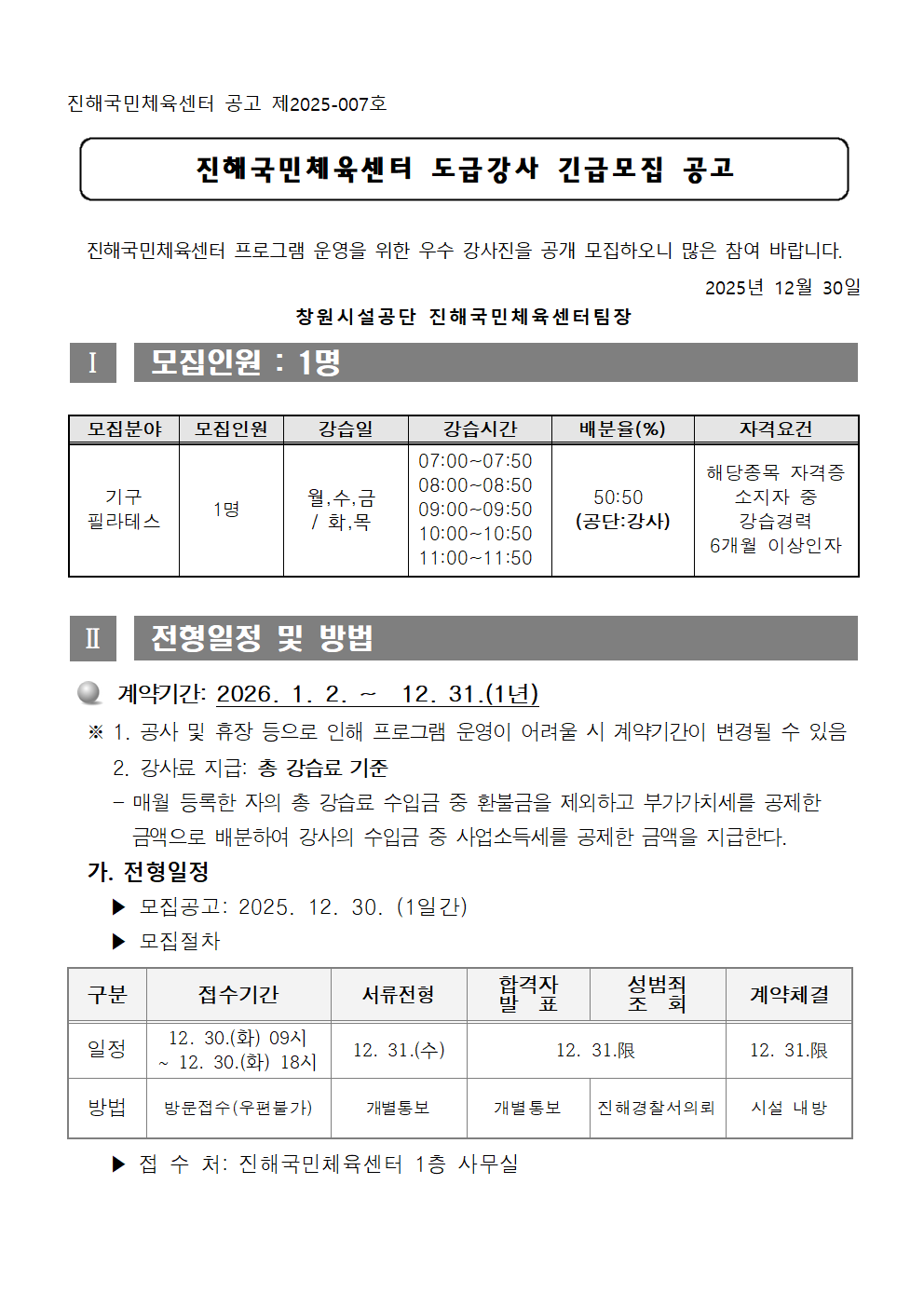진해국민체육센터 기구필라테스 도급강사 긴급 채용 공고입니다.